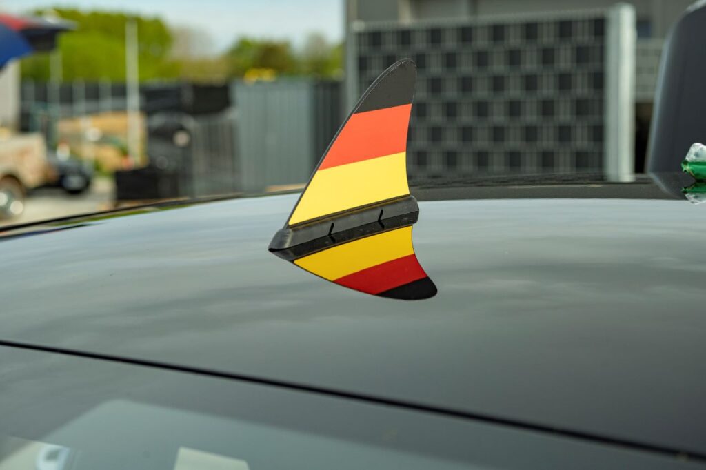 Flossen fürs Autodach können zum Geschoss werden: Bunte Fanflossen ähneln optisch Haiflossen und sind anlässlich der EM auf Autodächern zu finden. Sie verfügen über einen starken Magneten und können somit unkompliziert platziert werden. Die Testflosse für rund 20 Euro ist zugelassen für 180 km/h; empfohlen wird die Richtgeschwindigkeit von 130 km/h. Auf der Teststrecke bewegte sie sich nicht. Trotzdem ist sie nach Einschätzung von ACE und GTÜ nicht für die Autobahn geeignet: Sitzt sie nicht gerade oder gibt es starke Seitenwinde, kann die Flosse abfallen und zum gefährlichen Geschoss werden. Axel Sprenger: „Im Stadtbereich vielleicht denkbar, aber nicht bei höheren Geschwindigkeiten.“